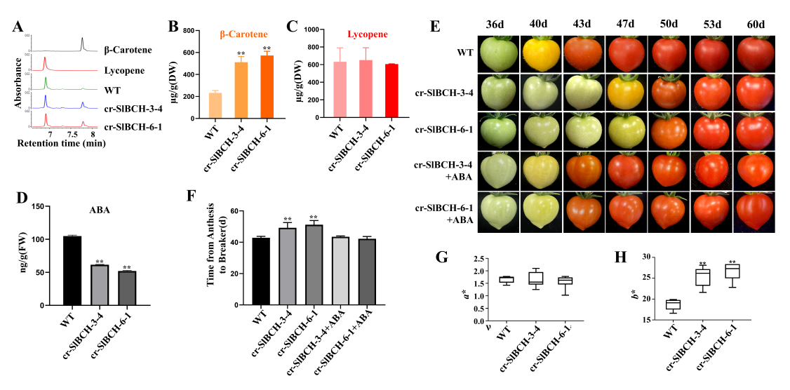 研究结果显示,经LC-MS检测,两个突变体番茄的β-胡萝卜素含量均显著提升:cr-SlLCYe突变体含量为野生型的1.7-2.4倍,cr-SlBCH突变体为野生型的2.3-2.5倍,且番茄红素含量未受影响,避免了传统育种中“顾此失彼”的问题。
