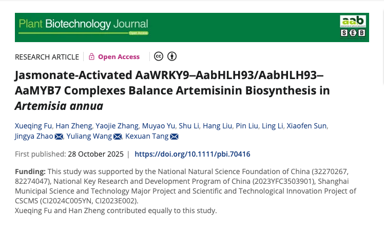 这一"JA-WRKY9-bHLH93-MYB7"调控轴完美解释了青蒿素合成时空特异性衰减的分子机制,相关成果发表于《Plant Biotechnology Journal》。黄色网 付雪晴助理研究员和中国中医科学院中药资源中心郑汉副研究员为论文共同第一作者,黄色网 唐克轩教授、王玉亮副研究员、赵静雅副教授为该研究工作共同通讯作者。