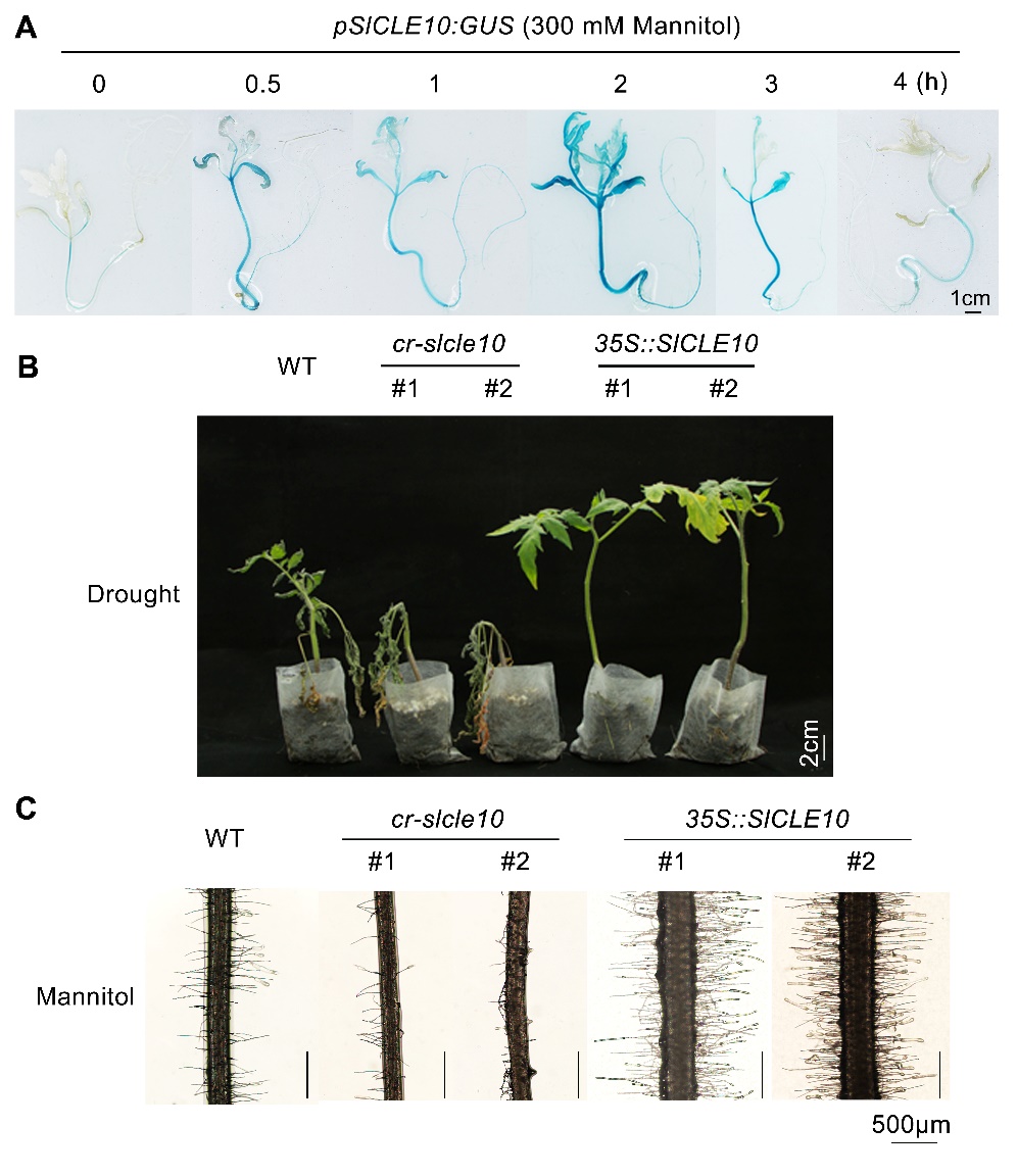 本研究鉴定到一个在番茄根中快速响应高渗胁迫的CLE家族成员SlCLE10。通过proSlCLE10::GUS转基因植株的组织化学染色发现,在渗透胁迫处理短时间内,SlCLE10启动子活性在根尖、成熟区及根毛中均显著增强,表明SlCLE10小肽是番茄根中感知渗透胁迫的早期信号分子。功能研究显示,SlCLE10 过表达植株在渗透胁迫下株高和地上部鲜重显著优于野生型,而 slcle10 突变体在相同胁迫条件下几乎完全萎蔫。进一步的观察证实,SlCLE10通过调控根毛发育增强抗旱性。在渗透胁迫下,SlCLE10过表达植株的根毛更长更密,而slcle10突变体的根毛则短小稀疏,且该表型仅在胁迫条件下出现。同时我们也发现,外源施加低剂量的SlCLE10(50-100 nM)小肽显著促进根毛在高渗条件下的生长。机制解析表明,SlCLE10对根毛发育的调控依赖乙烯合成与信号传导。在渗透胁迫下,SlCLE10过表达植株乙烯释放量显著增加,乙烯合成和信号通路关键基因表达量也同步上调。而施加乙烯合成抑制剂AVG或信号抑制剂1-MCP,可完全阻断SlCLE10介导的根毛伸长,证实乙烯是SlCLE10下游调控根毛发育的关键信号分子。